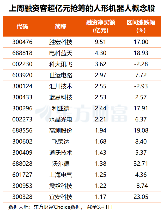 资金方面,上周共有116只人形机器人概念股获得融资净买入,其中15股融资净买额超1亿元。其中,胜宏科技获融资客抢筹9.51亿元,电科蓝天、科大讯飞分别获杠杆资金加仓4.30亿和3.62亿元,世运电路、汇川技术、蓝思科技、利亚德、水晶光电融资净买额均在2亿元以上。