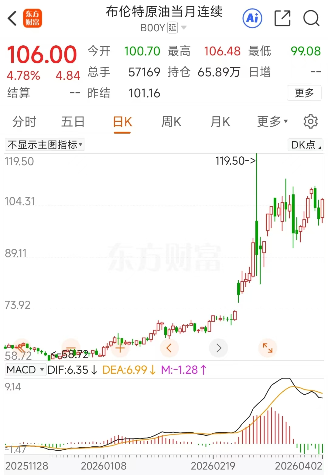 受特朗普最新讲话刺激,布伦特原油和WTI原油均出现短时快速拉升的走势。布伦特原油从99美元附近快速拉升至105美元上方,WTI原油从97美元附近拉升至104美元附近。截稿时,布伦特原油日内大涨超4%,WTI原油大涨超3%。