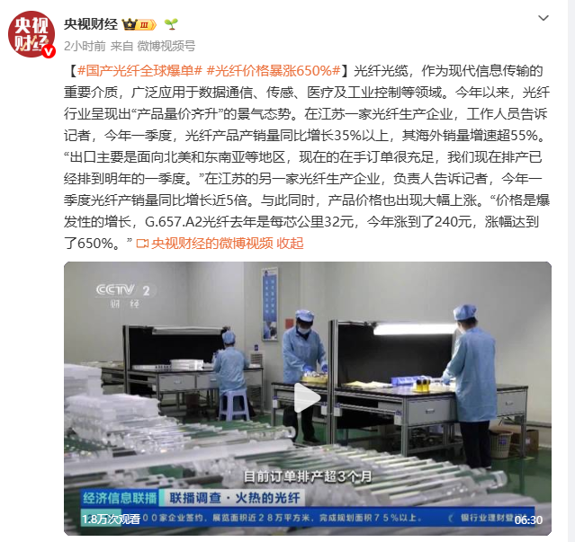 原标题:国产光纤全球爆单 部分产品价格暴涨650%